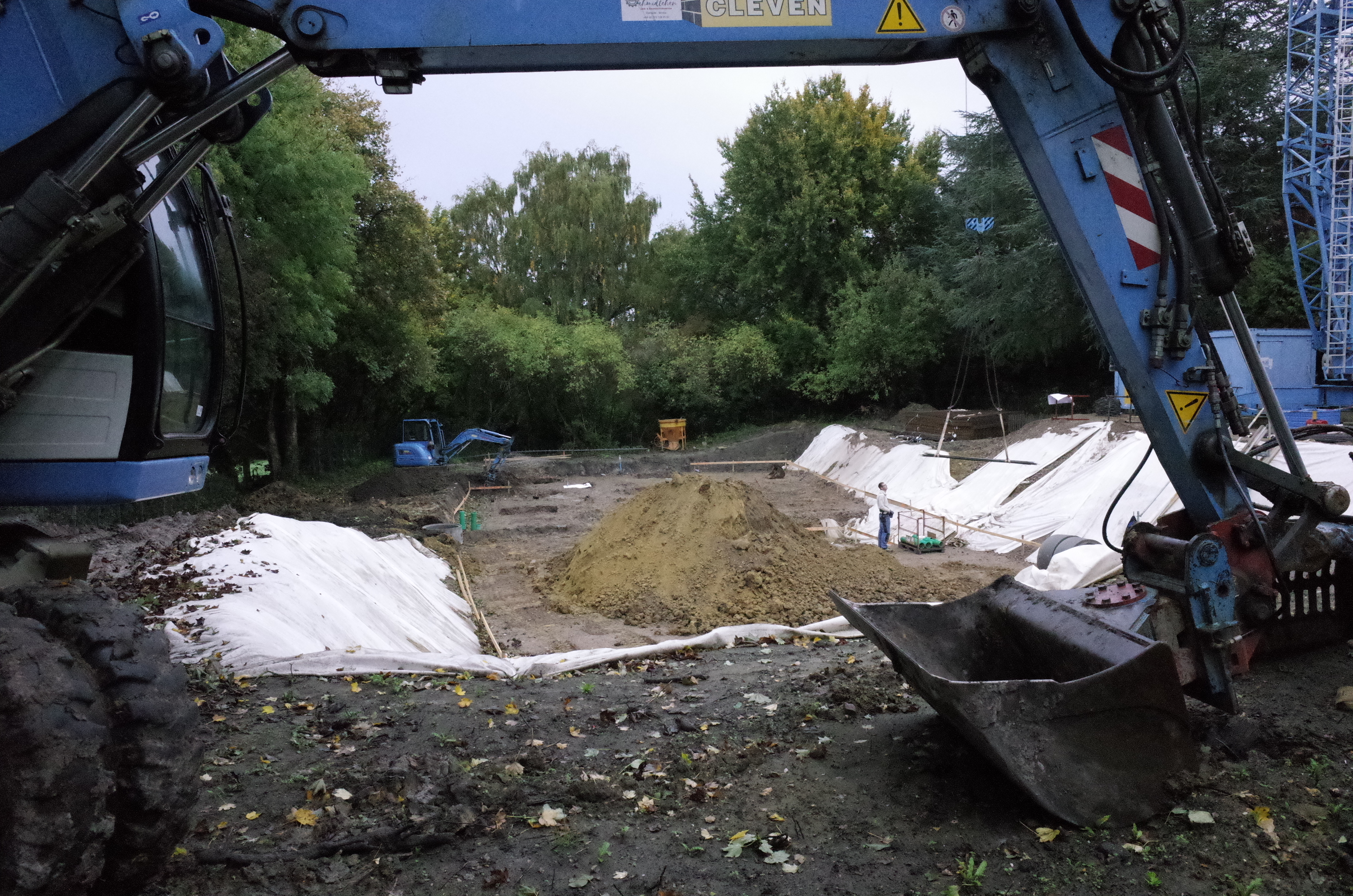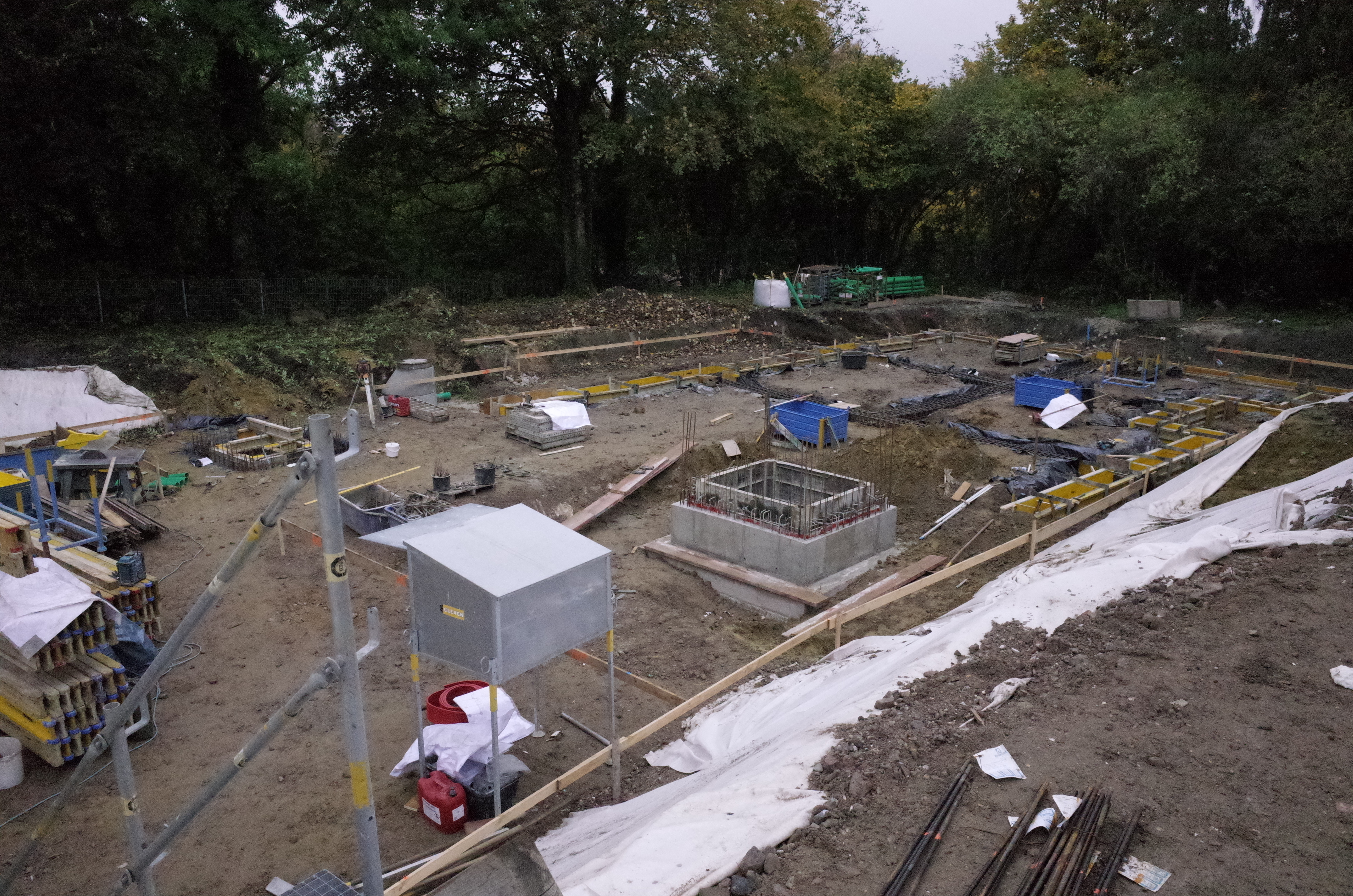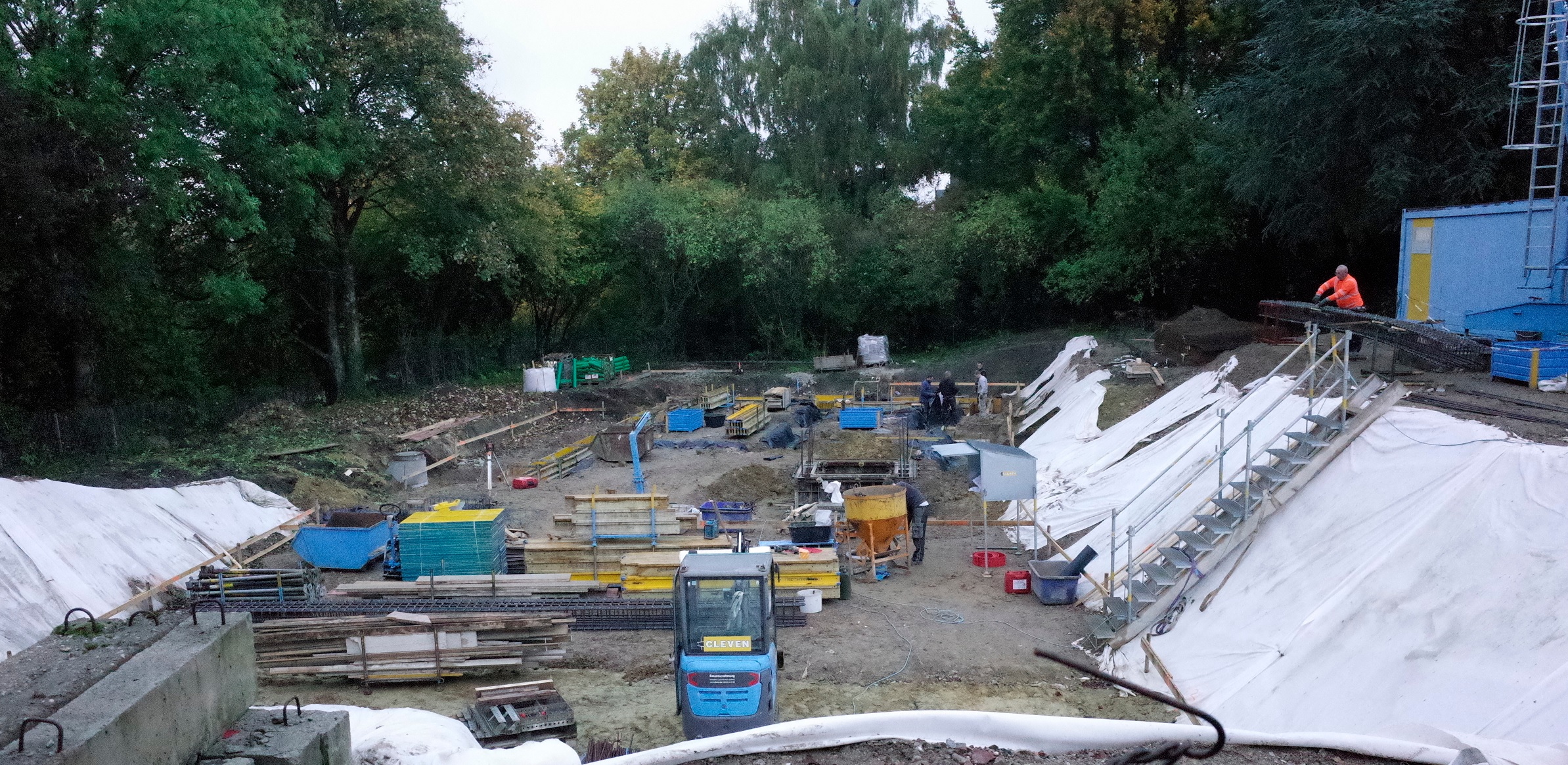 Im hinteren Bereich sind die ersten Schalungen für das Fundament zu sehen. Links hinter dem kleinen blauen Container ist die Grube für die Hebeanlage, rechts mittig wächst die "Unterfahrt" für den Aufzug. Auf der rechten Seiten werden so genannte Armierungsstränge hergestellt. Foto: VKM Aachen (16.10.2025)