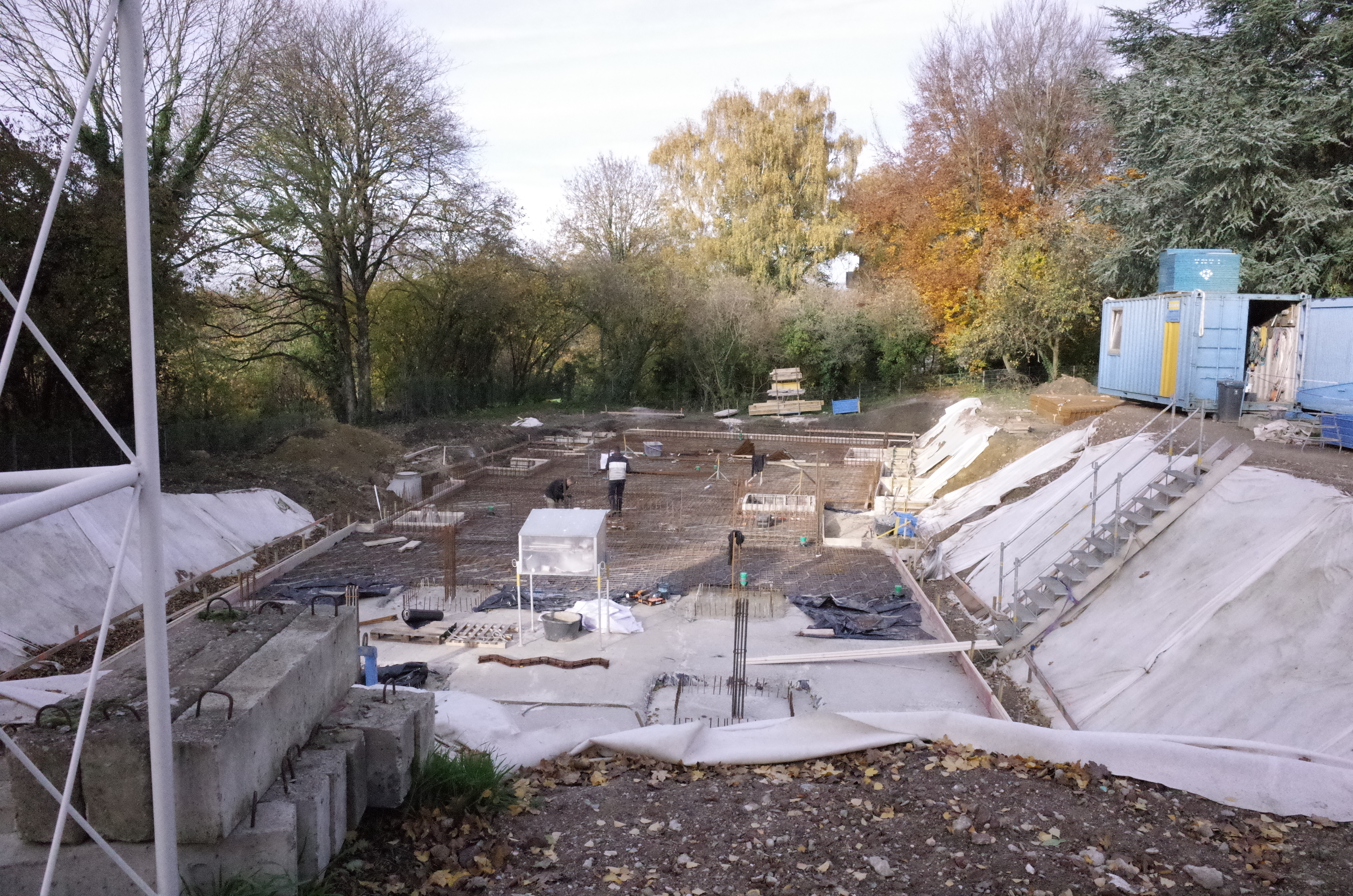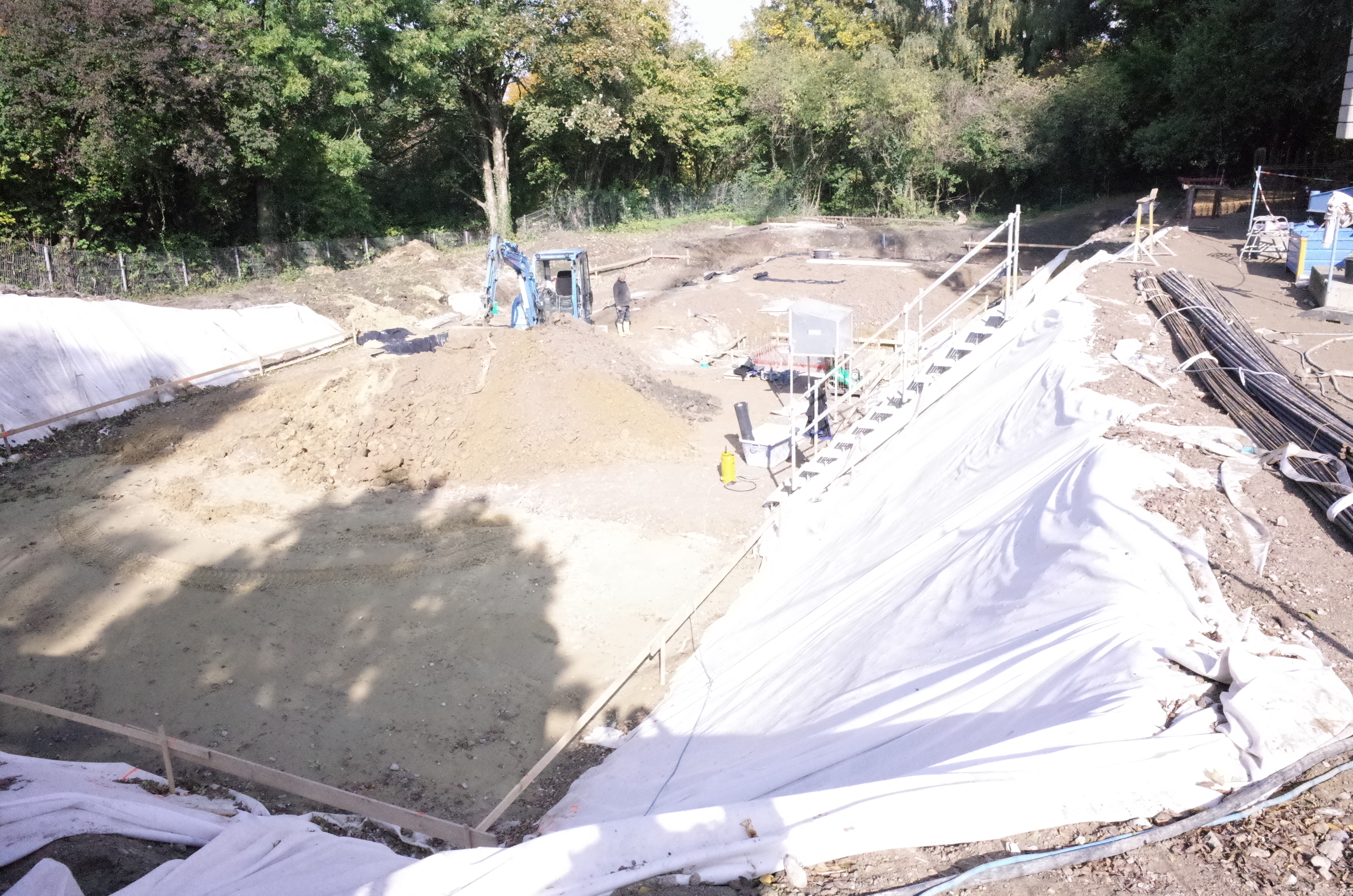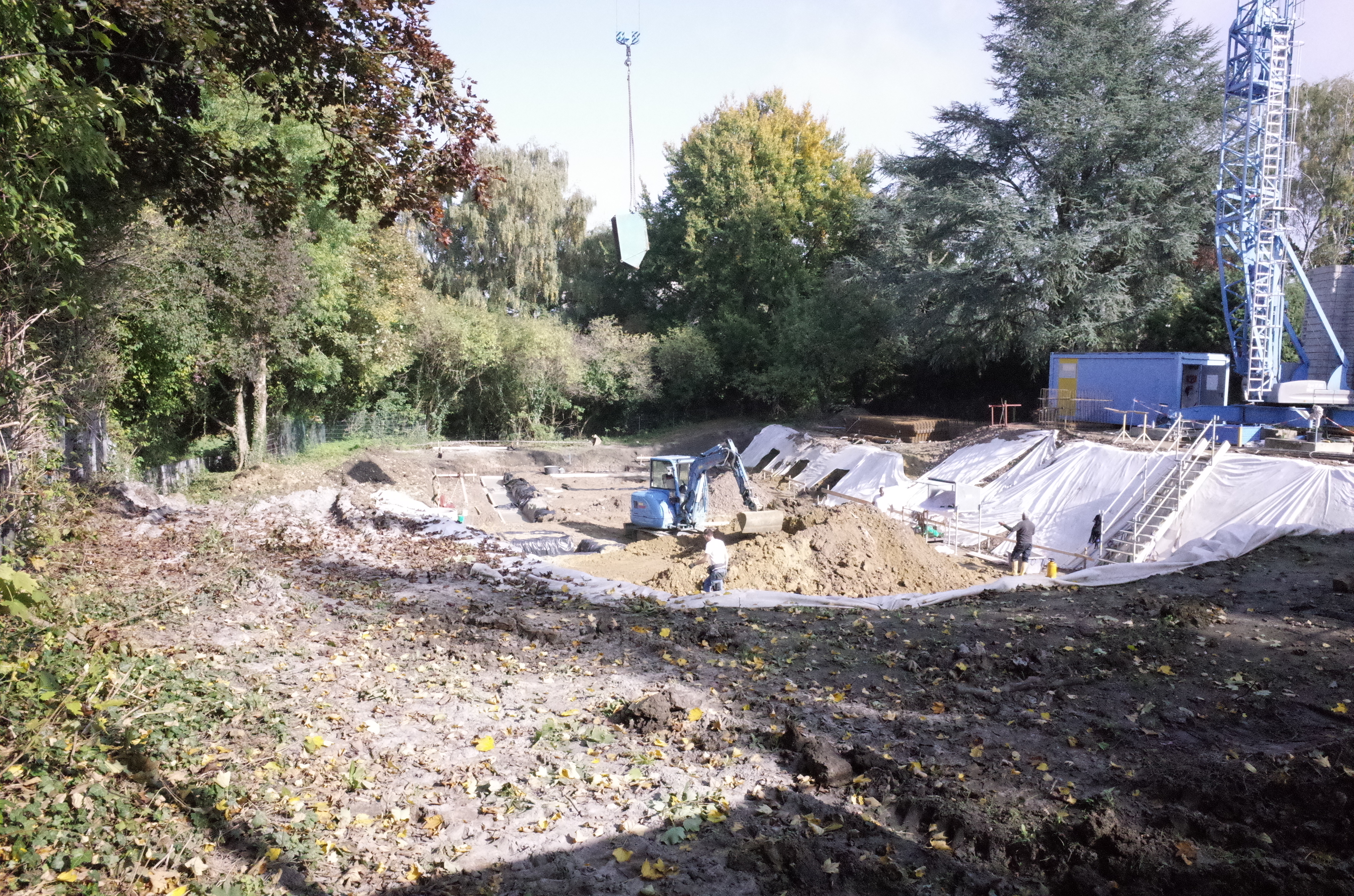 Im hinteren Bereich sind die ersten Schalungen für das Fundament zu sehen. Links hinter dem kleinen blauen Container ist die Grube für die Hebeanlage, rechts mittig wächst die "Unterfahrt" für den Aufzug. Auf der rechten Seiten werden so genannte Armierungsstränge hergestellt. Foto: VKM Aachen (16.10.2025)